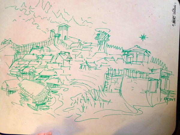 Un chemin, qui mène à l'escalier de la tour est (désormais rehaussée de son étrange moulin "horizontal"), sépare les "bourgeois" précédents de leurs voisins paysans du "quartier du temple" : deux douzaines de maisons de plein-pied, pour la plupart de bois et de torchis, adjointes de granges et d'étables entre lesquelles des treilles délimitent les potagers. C'est là que vivent la plupart des "glaiseux" : bergers, bûcherons, métayers et ouvriers sans terrain ni bétail, employés aux élevages et aux cultures qui s'étendent sur plusieurs lieues le long du lit de la rivière. A la limite de la place, seule construction en pierres de taille, la Chapelle des Pères où officie le bon Frère Daverom, clerc, herboriste, intendant de la garnison et même maître d'école quand les travaux des champs en laisse le loisir aux enfants du village. Plutôt débonnaire, peu porté au prosélytisme, il est apprécié de toute la communauté, Emishen compris, quoique pas très "respecté".